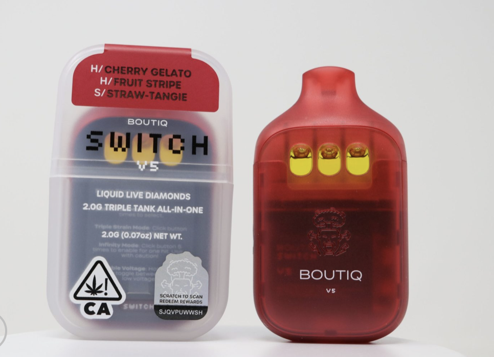 Experience flavor variety like never before with the Boutiq Switch V5 (2g) – Cherry Gelato x Fruit Stripe x Straw-Tangie. This triple-chamber disposable lets you switch between three delicious strains or mix them for a customized hit. Expect bursts of cherry, tropical candy, and tangy citrus — all in a sleek, rechargeable device built for smooth, potent performance.