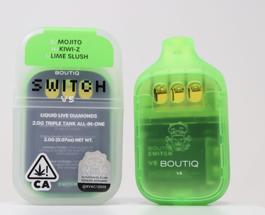 Refresh your senses with the Boutiq Switch V5 (2g) – Mojito x Kiwi-Z x Lime Slush. This triple-chamber disposable lets you switch between three zesty strains or mix them for a custom flavor combo. Expect bright citrus, tangy kiwi, and cool mint notes with smooth, potent vapor in a sleek, rechargeable device built for all-day enjoyment.