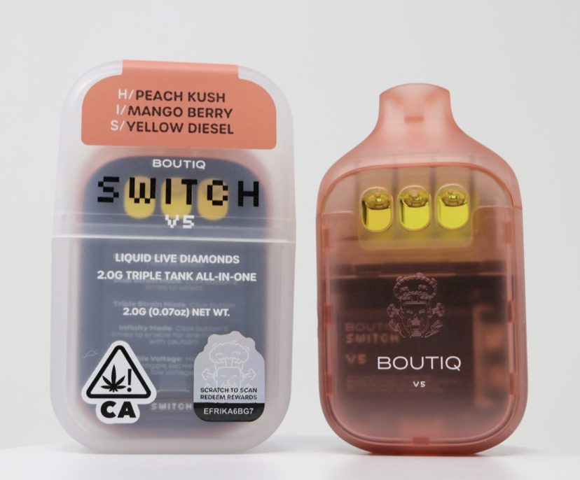 Enjoy a burst of fruity power with the Boutiq Switch V5 (2g) – Peach Kush x Mango Berry x Yellow Diesel. This triple-chamber disposable lets you switch between three flavorful strains or mix them for a customized session. Expect notes of peach, mango, and citrus diesel with smooth, potent vapor — all in a sleek, rechargeable device built for consistent performance.